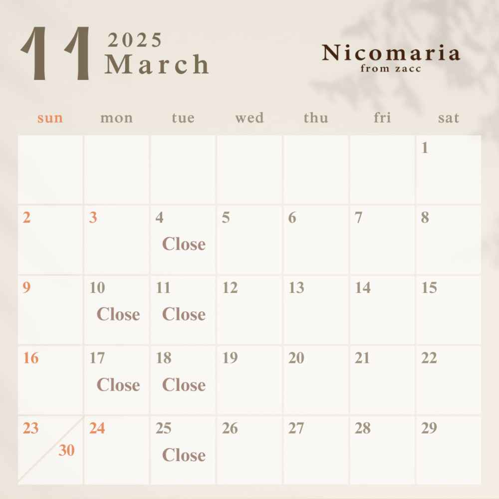 11月の休業日のお知らせ 2025年10月23日 最終更新日時 : 2025年10月23日 nicomaria いつも当店をご利用ありがとうございます。下記日程でお休みさせていただきます。 お客様にはご不便をおかけ致しますが、何卒ご理解とご協力をお願い致します。